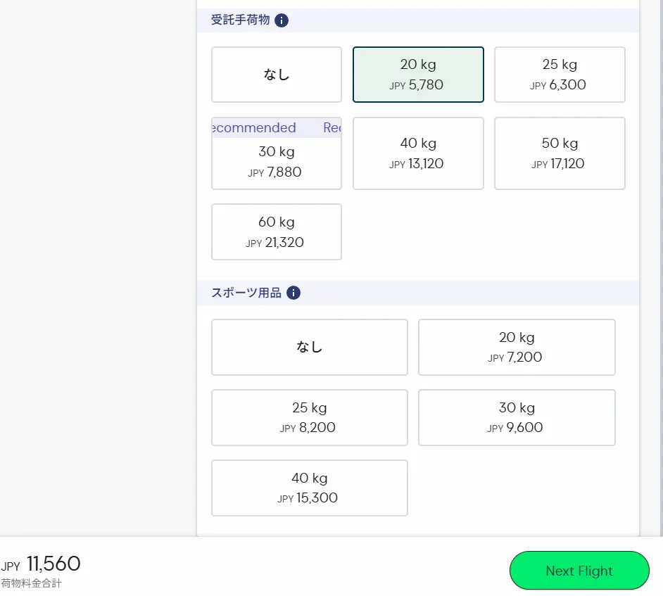 15kg・20kg・25kg・30kg・40kg・50kg・60kgの内から選択(乗客一人が購入できる最大重量は60kgまで)
